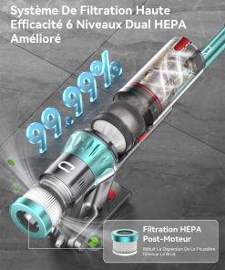 - Double Système de Filtration HEPA Niveau 6: Équipé d’un filtre HEPA avant et d’un système de filtration HEPA après le moteur, il capture efficacement 99,99 % des particules de poussière. La filtration HEPA post-moteur contrôle mieux le flux d’air, limite la dispersion des poussières et réduit les nuisances sonores liées à l’évacuation.