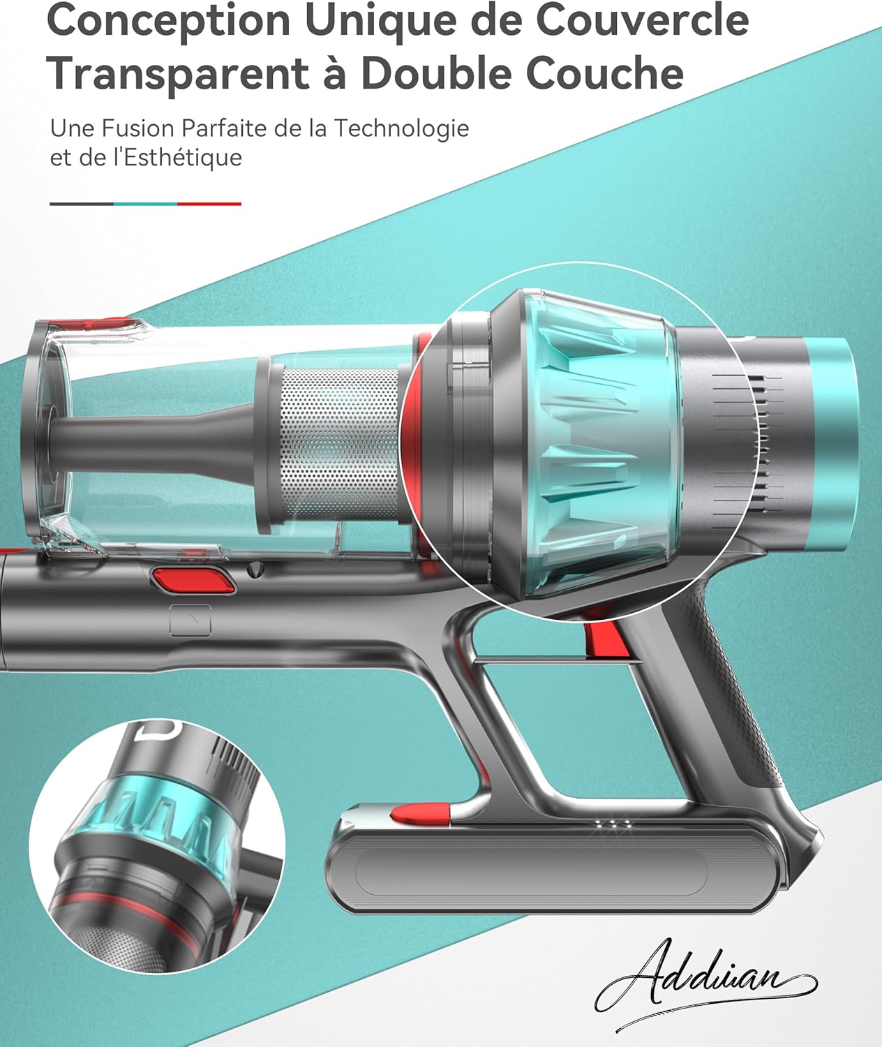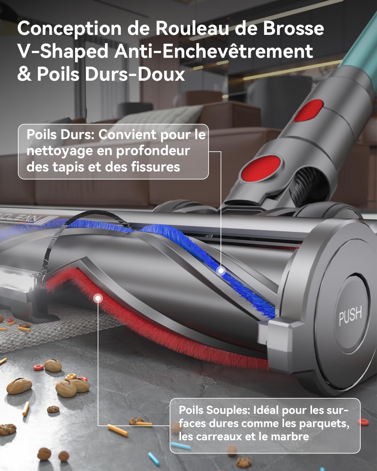 - Brosse en V Anti-enchevêtrement: La brosse innovante en forme de V empêche efficacement l’enchevêtrement des cheveux, aspirant facilement les cheveux longs et les poils d’animaux, et réduisant ainsi la fréquence de nettoyage de la brosse. Combinée à un éclairage LED haute intensité, elle éclaire aisément les zones sombres sous les lits et les canapés.