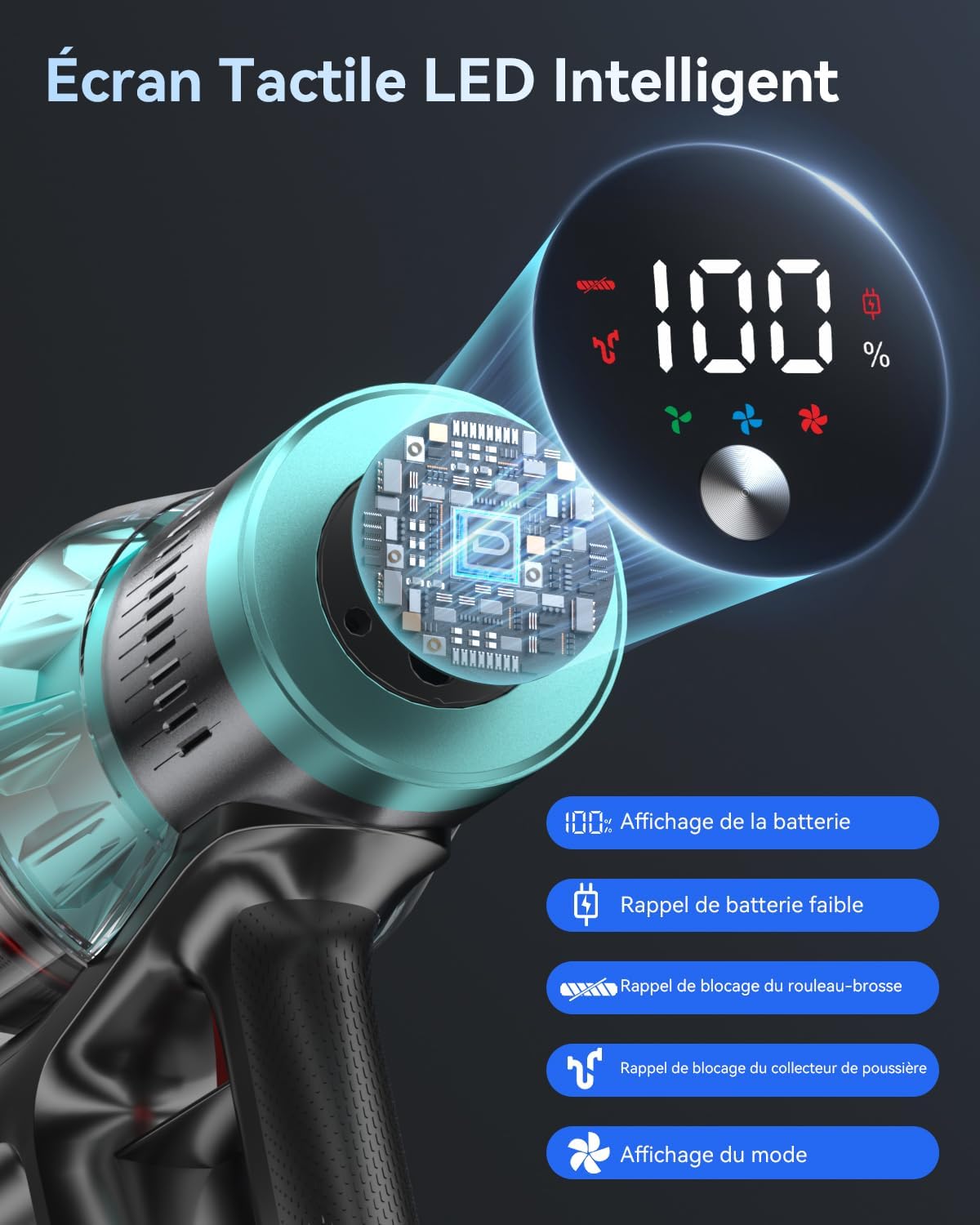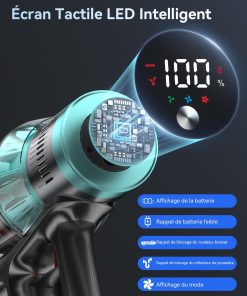 - Écran LED Intelligent: Équipé d’un écran LED multifonction, il permet de basculer entre les modes d’aspiration en un seul geste et d’afficher en temps réel la batterie restante, la puissance et les alertes de blocage. Une interface claire et intuitive pour un nettoyage en toute tranquillité.