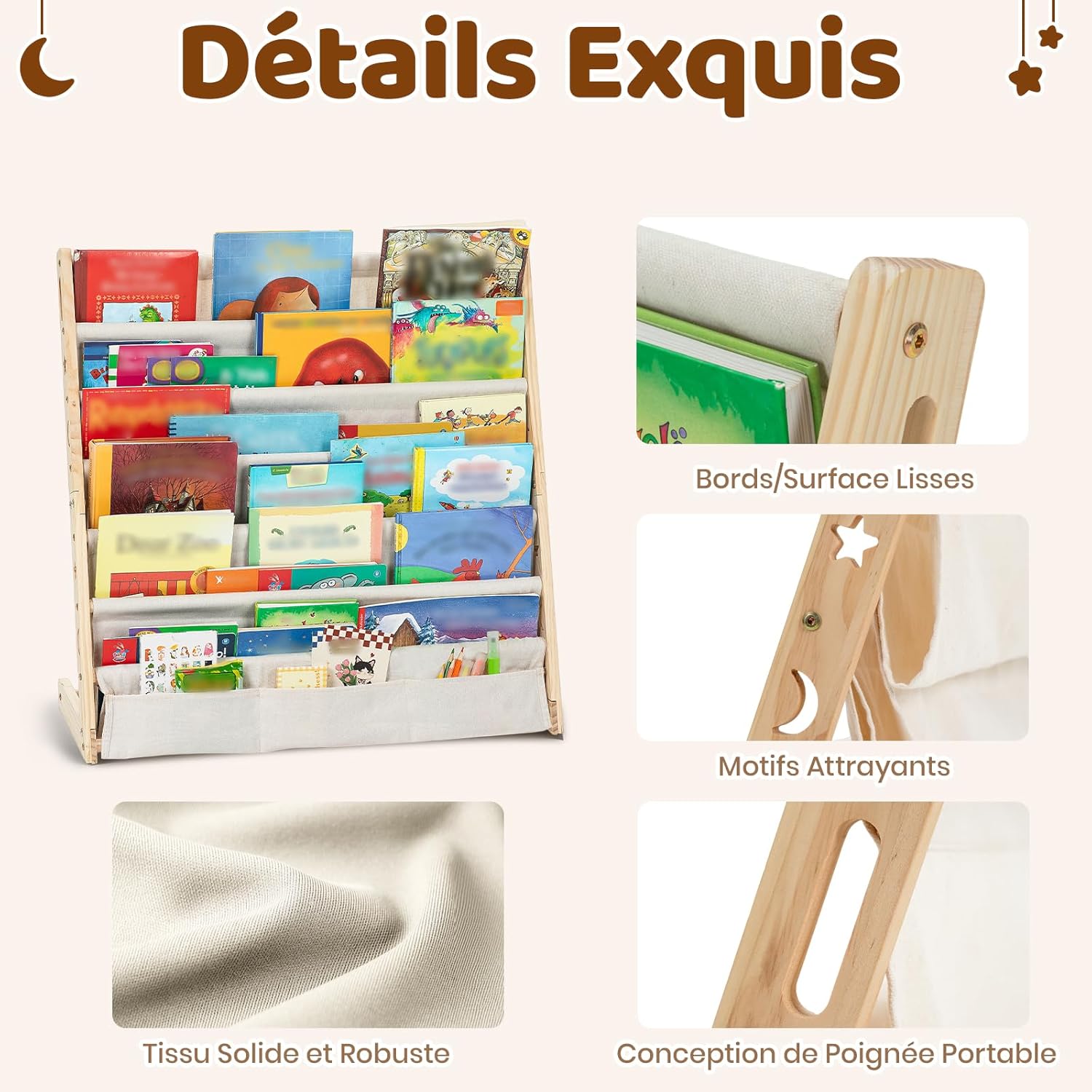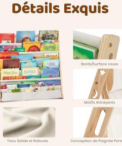- Poches en Tissu Résistantes et Faciles à Nettoyer : Équipée de poches en tissu de haute qualité, cette bibliothèque permet de ranger des livres de différentes tailles. Les poches sont faciles à entretenir, offrant une solution de rangement pratique et durable