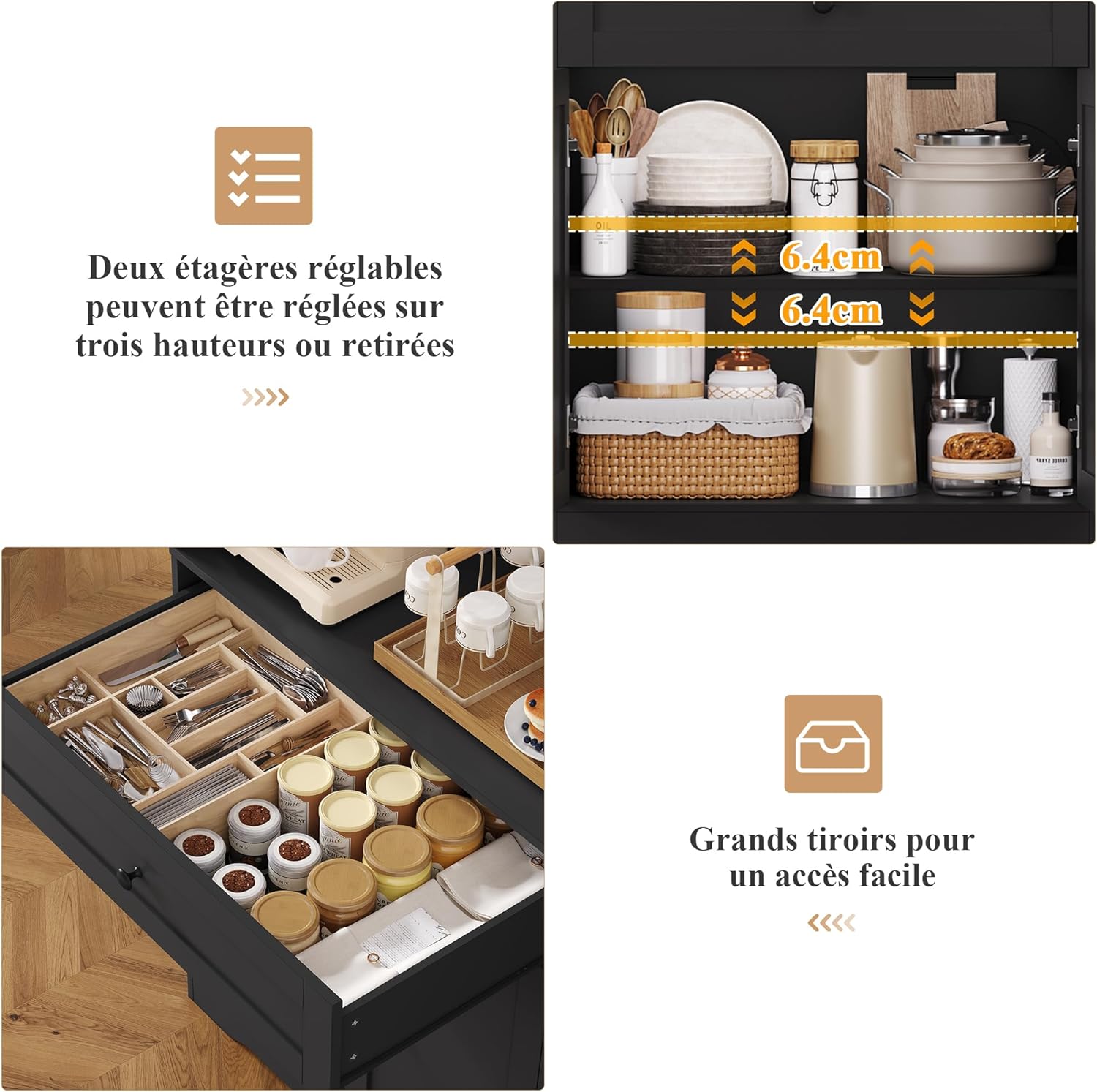 - Design Bien Pensé : Fatigué des bruits de cliquetis ? FOREHILL armoire de cuisine est équipée de charnières métalliques à fermeture douce, permettant aux portes de se fermer lentement et silencieusement grâce à un glissement en douceur. Un trou pré-percé est prévu à l’arrière du plan de travail pour faciliter le passage des câbles. Nous recommandons également l’installation d’un dispositif anti-basculement pour fixer le buffet au mur