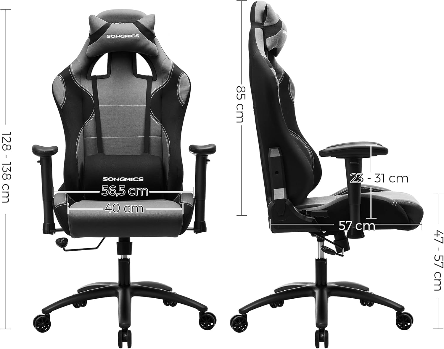 - Dimensions : hauteur d’assise : 47-57 cm ; Hauteur totale : 128-138 cm ; Largeur chaise : 40-56,5 cm ; profondeur d’assise : 57 cm ; Hauteur dossier : 85 cm ; Largeur dossier : 60 cm ; Diamètre du rouleau : 65 mm