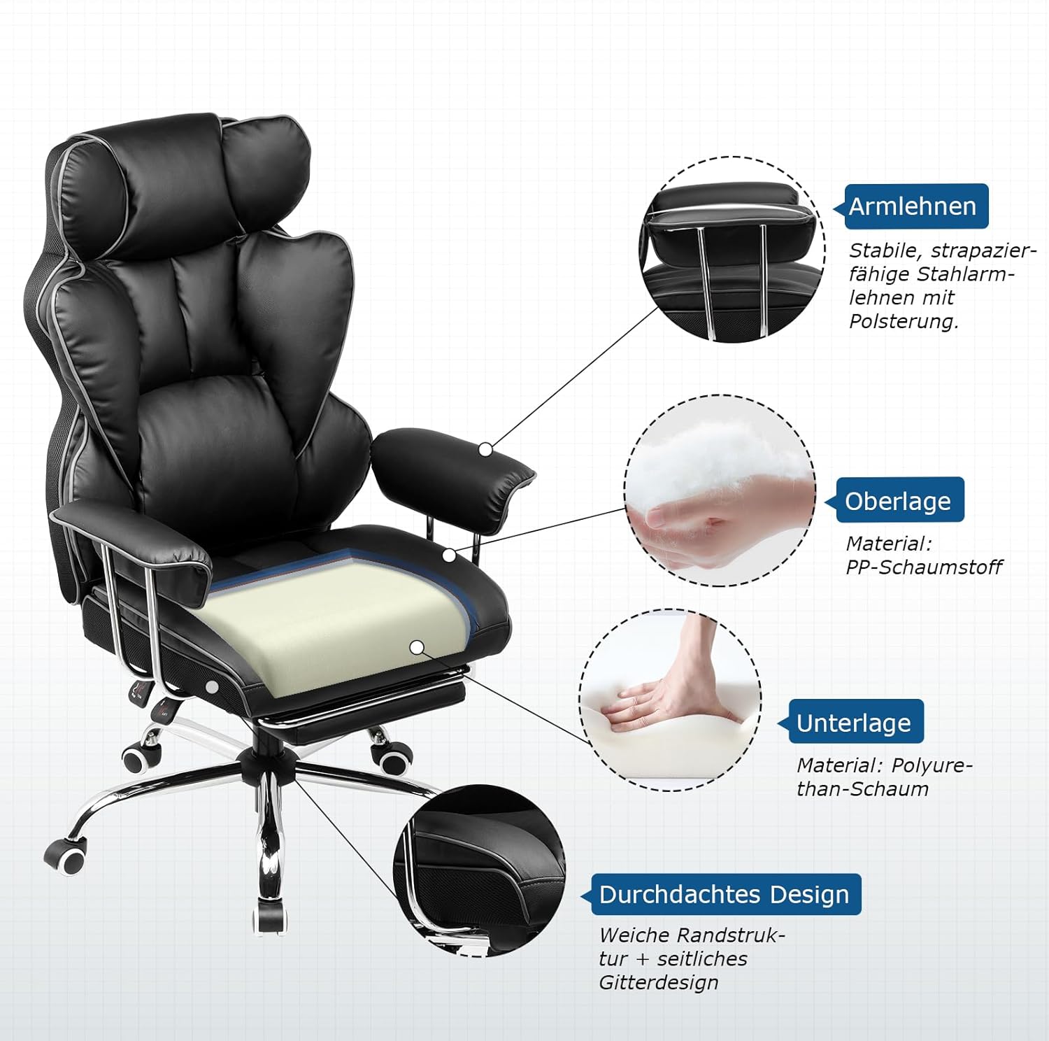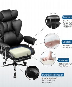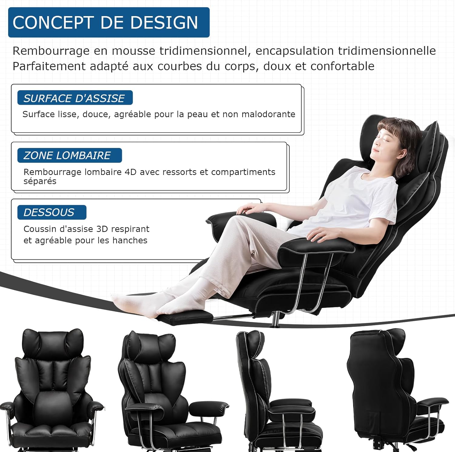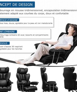 Chaise confortable et bien conçue avec un bon soutien lombaire et une assise réglable qui permet de rester installé longtemps, le repose-pieds télescopique est pratique et le siège pivotant fonctionne de manière fluide; le montage est simple et le revêtement noir est sobre et solide. Note : 5