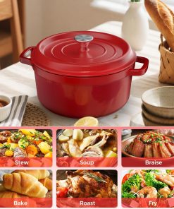 Cocotte solide et bien finie, idéale pour préparer des soupes, ragoûts ou même du pain ; la capacité 5 L est pratique pour les repas en famille, le couvercle s’ajuste bien et le revêtement antiadhésif facilite le nettoyage, le rouge donne une belle touche en cuisine.