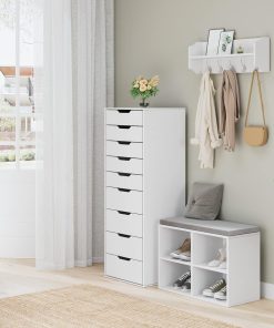 Commode pratique et bien finie, les neuf tiroirs offrent un rangement généreux sans occuper trop d’espace, le montage est simple et la finition blanche s’intègre facilement dans une chambre ou un salon pour un usage quotidien.