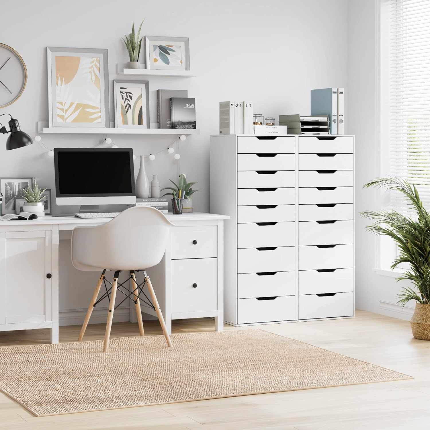 Très belle commode blanche à neuf tiroirs, sobre et fonctionnelle; les tiroirs glissent bien et offrent un bon volume de rangement sans encombrer, les finitions sont soignées et le montage a été plutôt simple, parfaite pour une chambre ou un bureau.