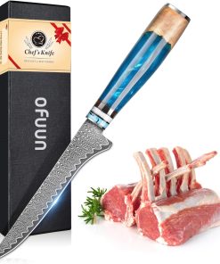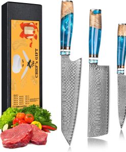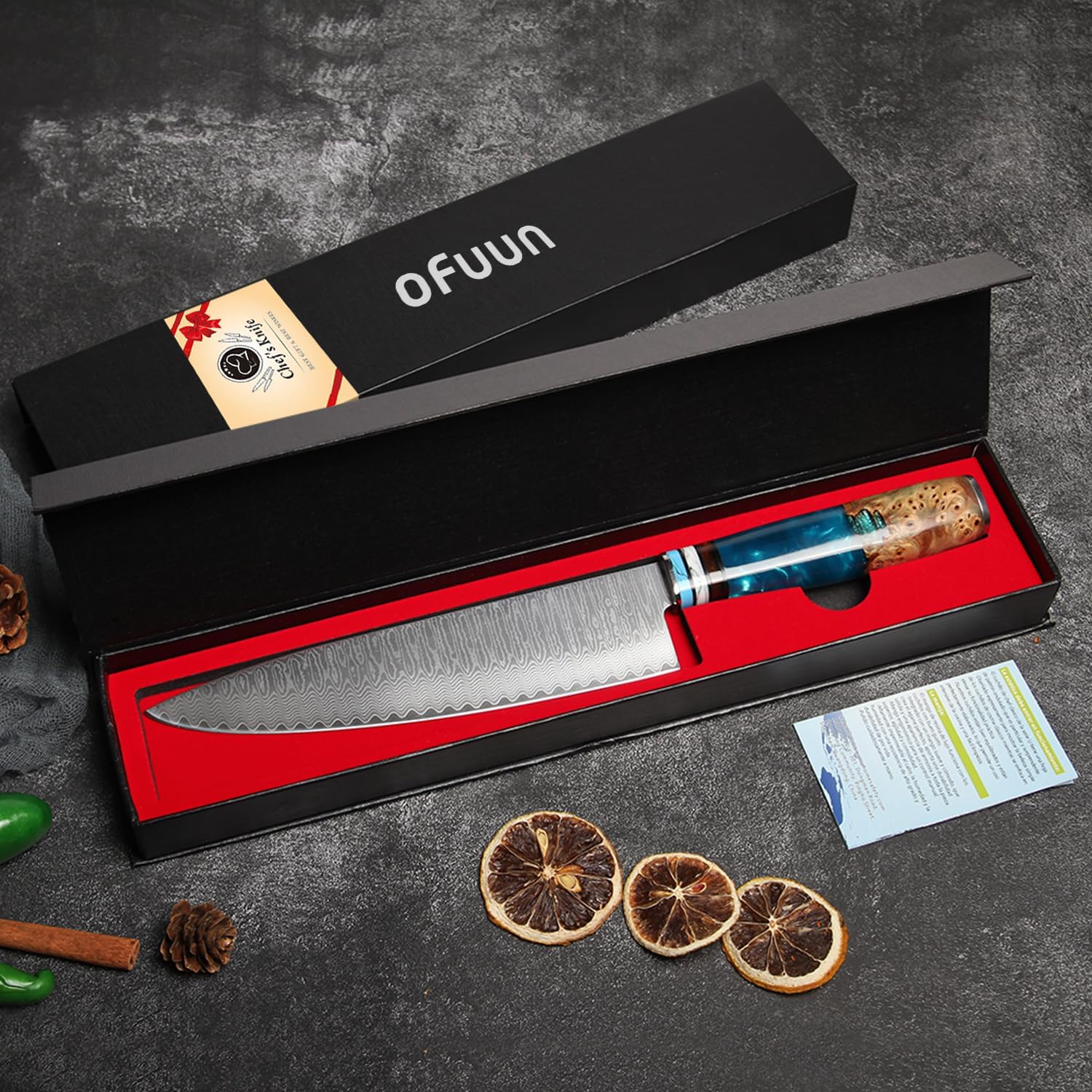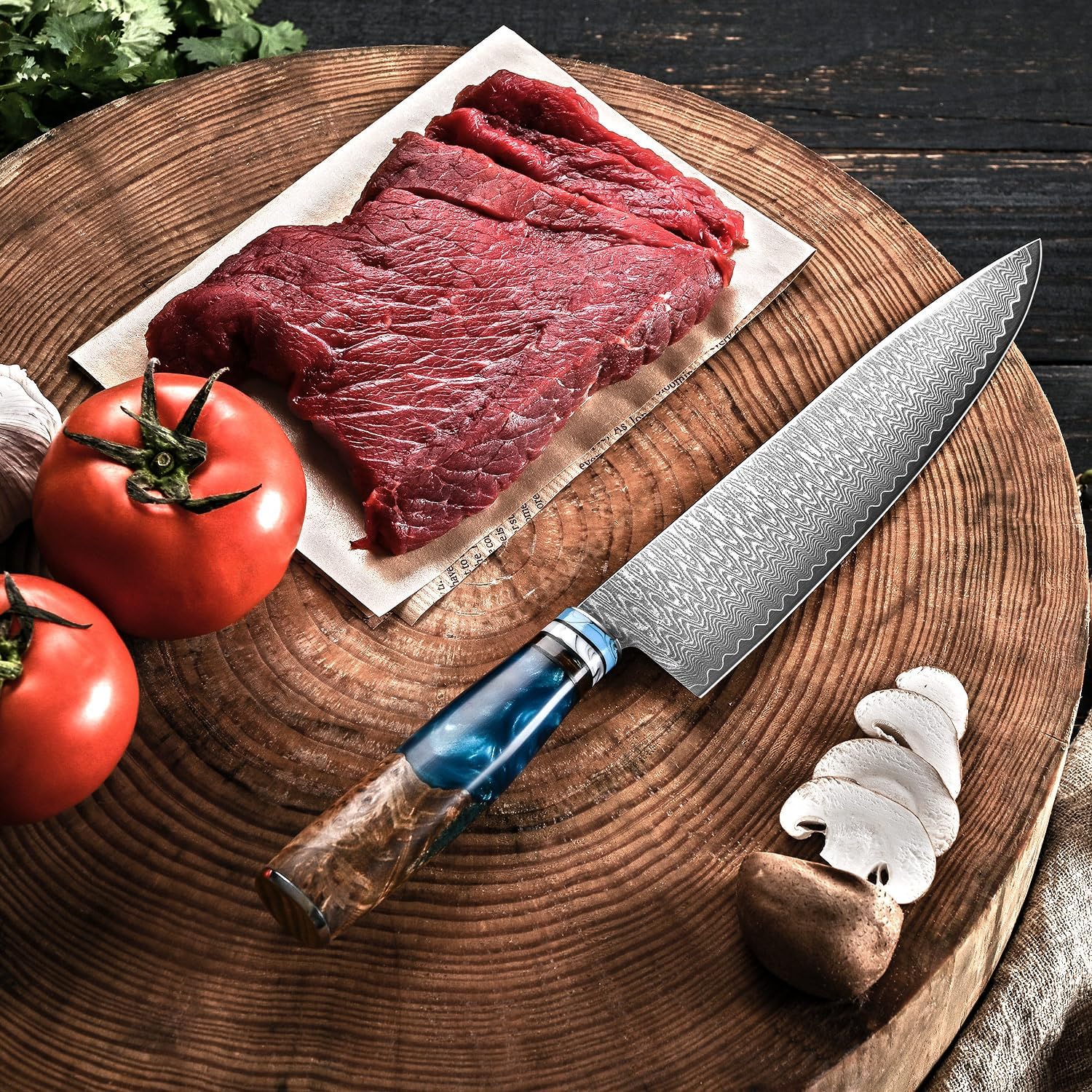 Couteau magnifique et très efficace : la lame en Damas de 20 cm est incroyablement tranchante et tient bien le fil, le manche en résine bleue est ergonomique et agréable en main, l’équilibre est parfait et la présentation en boîte cadeau en fait un excellent choix pour cuisiner au quotidien ou offrir.