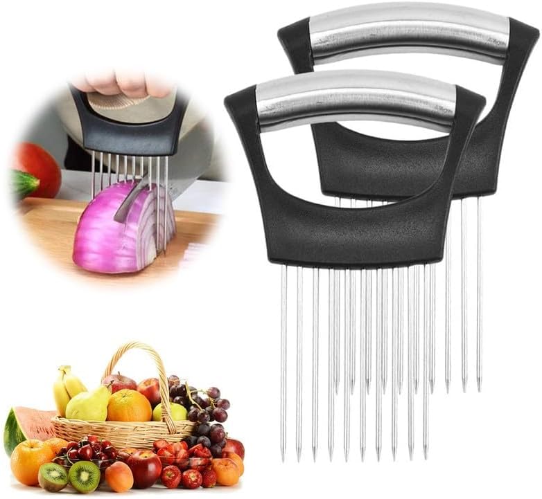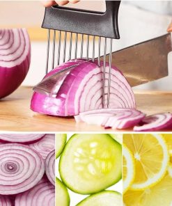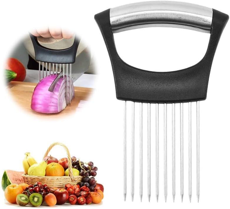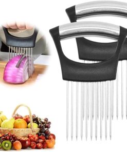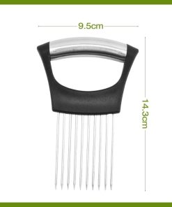 - Trancheuse à oignons : Cette trancheuse est équipée de 10 fourchettes en acier inoxydable qui maintiennent les oignons en place, ce qui rend le tranchage rapide et facile. Il comprend une prise confortable et une conception antidérapante pour plus de commodité.