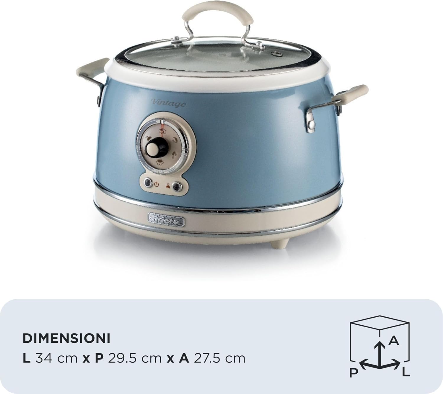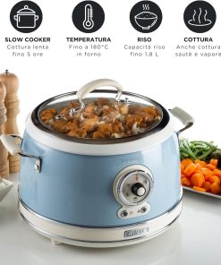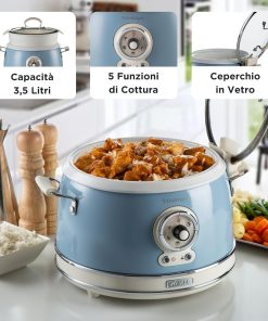Le cuiseur à riz Ariete 2904 est pratique et performant; sa capacité de 3,5 L convient bien pour une petite famille, la fonction mijoteuse et la cuisson à la vapeur offrent une belle polyvalence, et le revêtement céramique facilite le nettoyage. Le design vintage en couleur céleste apporte une touche esthétique à la cuisine.