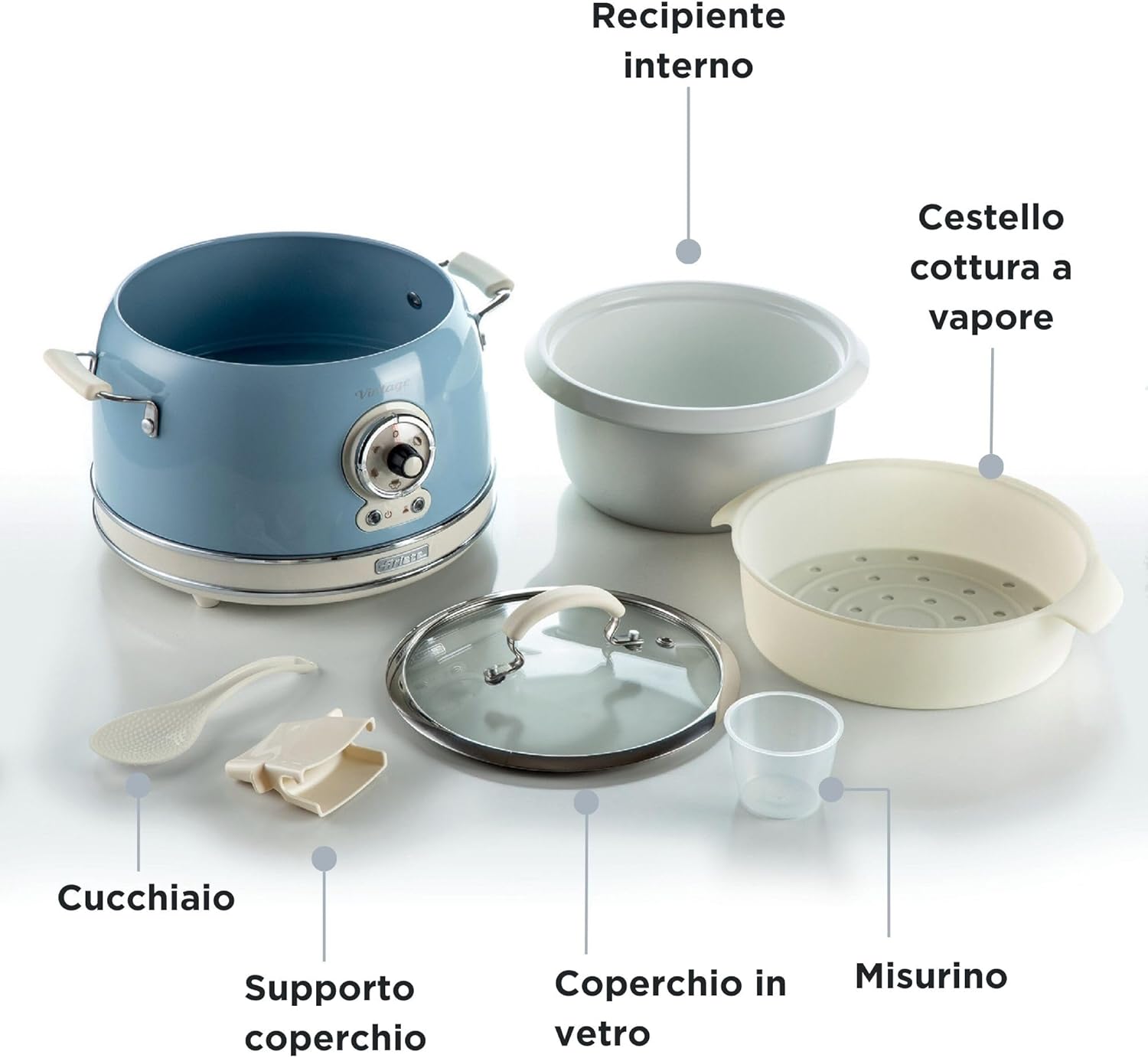 Cuiseur à riz électrique pour une cuisson parfaite du riz et de nombreux autres aliments, grâce à 5 modes de cuisson différents : riz, sauté, vapeur, chauffage et mijoteuse. Bol en céramique amovible pouvant être placé dans le four à 180°. Avec le cuiseur à riz électrique, vous pouvez préparer vos sushis préférés à la maison … mais pas seulement ! Cuire du riz nature pour préparer vos plats préférés n’a plus de secrets ! Avec Rice Cooker d’Ariete, la gamme Vintage s’enrichit d’un cuiseur à riz parfait, non seulement pour cuire le riz à la perfection, mais aussi de nombreux autres plats, en choisissant entre la cuisson sautée ou la cuisson vapeur. De nombreuses fonctions en un seul produit avec l’incontournable design Vintage d’Ariete : lignes douces, ambiance rétro et couleurs pastel pour donner une touche de style et de goût à votre cuisine !