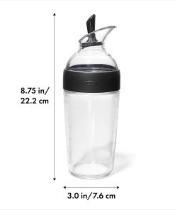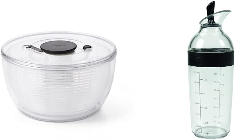 OXO Good Grips 1351580V2MLNYK Essoreuse à salade transparent/blanc, Plastique, Grand L’essoreuse à salade que nous avons présentée en 1998 a transformé l’ustensile en un élément de cuisine quotidien essentiel. Nous avons revisité l’essoreuse pour effectuer quelques améliorations tout en conservant les caractéristiques principales et l’inspiration originale : une toupie pour enfants. Avec un design moderne qui complète les cuisines contemporaines et un frein amélioré qui l’arrête net à chaque fois, nous pensons que vous allez adorer notre nouvelle version du design classique. Séchez les salades vertes d’une simple pression sur la poignée douce antidérapante. La base antidérapante maintient solidement le bol sur le plan de travail, et le bouton d’arrêt intégré arrête l’essoreuse pour la vider. Le panier fait aussi office de passoire, et le couvercle se défait pour un nettoyage facile. Oxo Good Grips Shaker à Vinaigrette Préparer rapidement une vinaigrette est simple avec le shaker à vinaigrette OXO Good Grips. Le shaker étanche offre un moyen propre, soigné et pratique de mélanger, servir et conserver les vinaigrettes, les sauces et les marinades. Le haut se dévisse pour révéler une large ouverture idéale pour ajouter une variété d’ingrédients comme l’huile, le vinaigre, la mayonnaise, la moutarde, l’ail, les oignons et les épices. Le Shaker est fabriqué dans un matériau sans bisphénol A, résistant aux chocs et lavable au lave-vaisselle. Une fois les ingrédients ajoutés, vissez le haut et agitez pour mélanger rapidement les ingrédients sans les renverser. Le levier sur le haut bascule vers l’arrière pour servir et vers l’avant pour sceller. Utilisez le shaker pour conserver les restes de vinaigrette et de sauce directement dans le réfrigérateur.