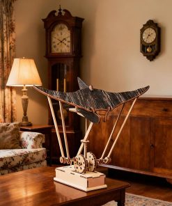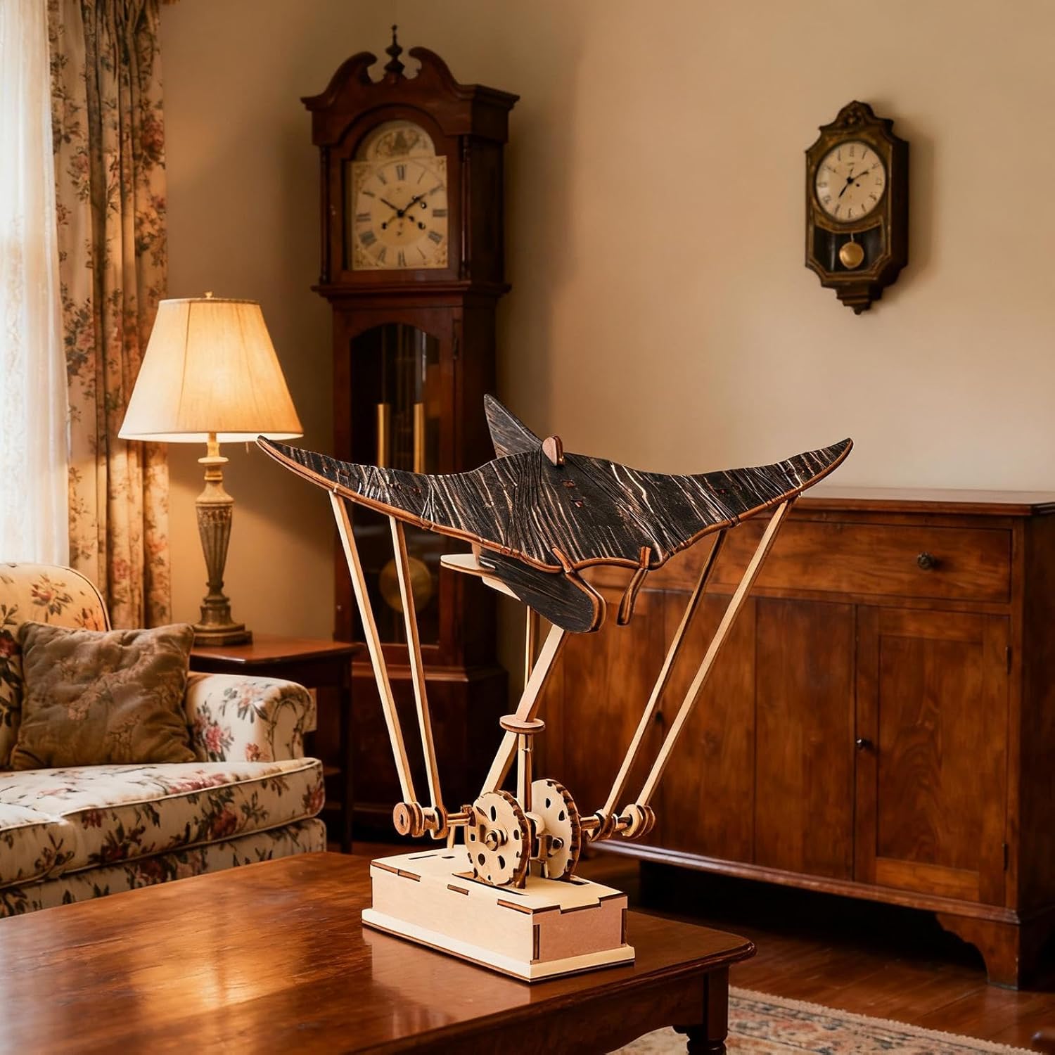 Ornement artisanal en bois représentant une raie manta, bien fini et réaliste, avec un mouvement électrique discret qui apporte une touche élégante au bureau. La pièce semble robuste et s’intègre facilement à la décoration sans être trop envahissante.