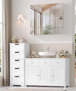 VASAGLE Meuble Salle de Bain Rangement, Armoire Gain de Place, Commode, avec 4 Tiroirs, Placard avec Porte, Étagère Réglable, 35 x 65 x 90 cm, Blanc Nuage LHC042W01