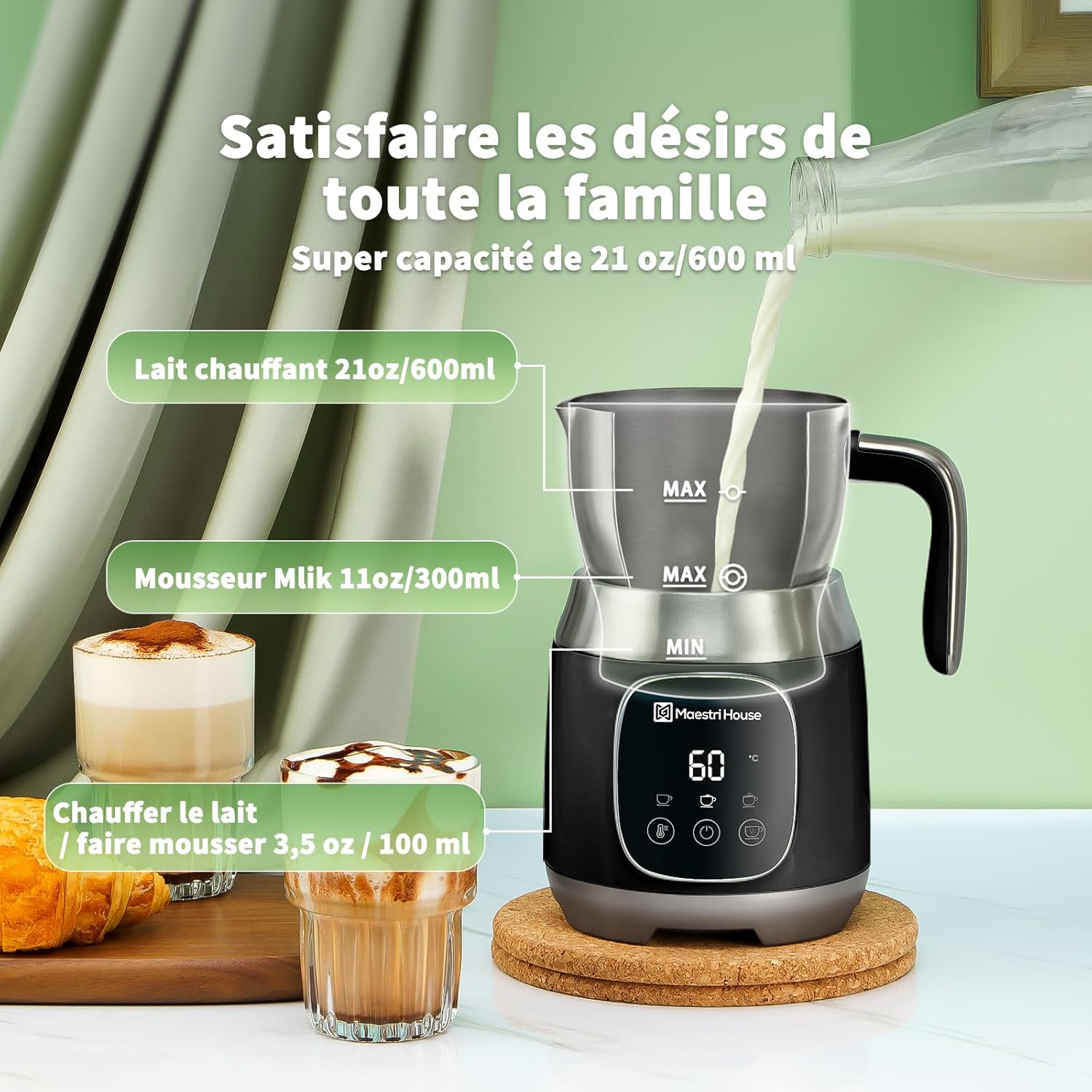 - 【21OZ/600ML Extra Large Capacity】With its 21oz (600mL) jug capacity, this electric frother and steamer offers the larger than most milk frothers, allowing you to prepare multiple moussey drinks at once. Capacité maximale de 10,1 oz (300 ml) de lait pour le moussage, de 17 oz (500 ml) pour le chocolat chaud et de 21 oz (600 ml) pour le chauffage