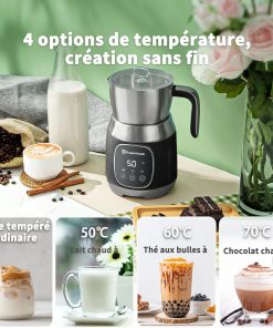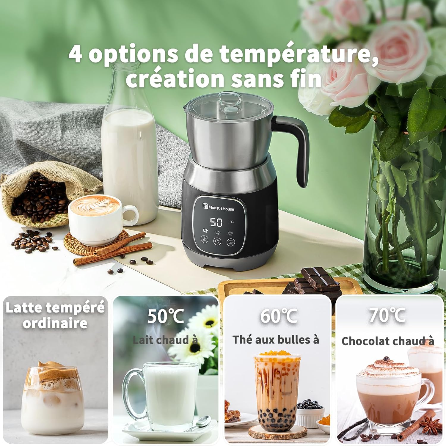 - 【Variable Temp & Froth Thickness 】 Le premier mousseur à lait au monde avec un réglage variable de la température et une sélection de l'épaisseur de la mousse. Le mousseur à lait électrique Maestri House vous offre 4 réglages de température : Temp ordinaire, 50℃, 60℃, 70℃, et il offre également 3 options d'épaisseur de mousse différentes : faible, moyenne et élevée. La possibilité de contrôler la température permet d'obtenir un café de qualité supérieure