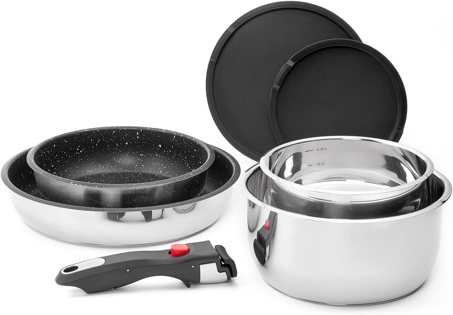 Set ROSSETTO de 7 pièces très pratique : l’inox est solide, les poignées amovibles facilitent le rangement et la cuisson au four, et les poêles antiadhésives 20/26 cm ainsi que les casseroles 16/20 cm chauffent bien sur induction et se nettoient facilement. Pas de revêtement PFAS, ce qui rassure, et l’ensemble est parfait pour un usage quotidien.