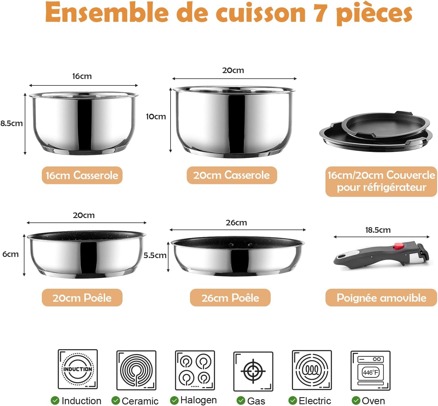 - Set de cuisson 7 pièces : Le set de casseroles et poêles comprend 2 poêles (20 cm/26 cm), 2 casseroles (16 cm/20 cm), 2 couvercles hermétiques (16 cm/20 cm) et 1 poignée amovible