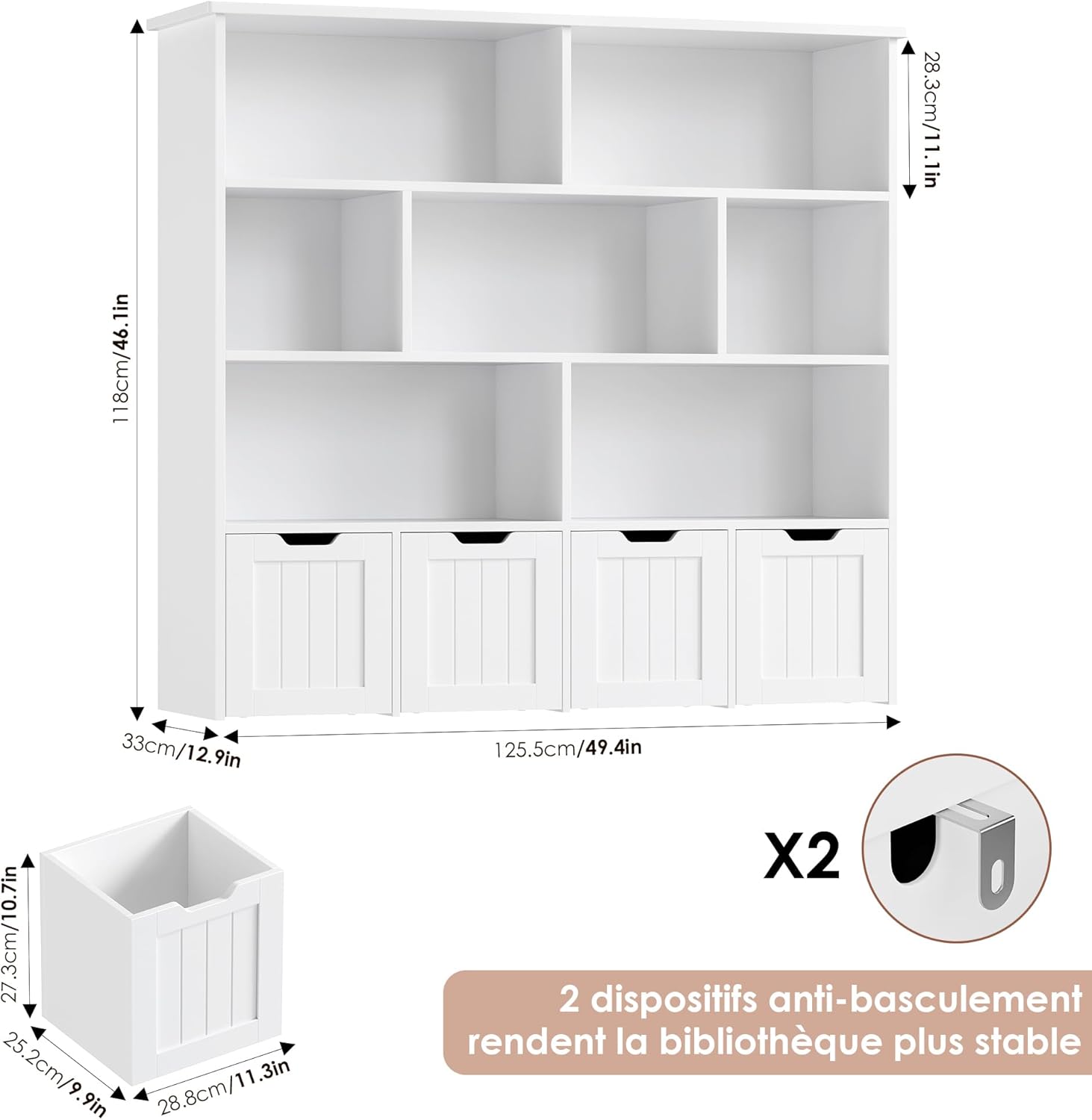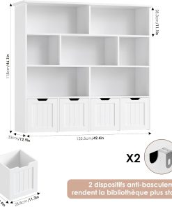 Produit très satisfaisant : montage assez simple, bonne qualité pour le prix, les 8 étagères et 4 tiroirs roulants offrent beaucoup de rangement pour livres et jouets, le coloris blanc s’intègre bien dans la chambre et l’ensemble paraît solide.