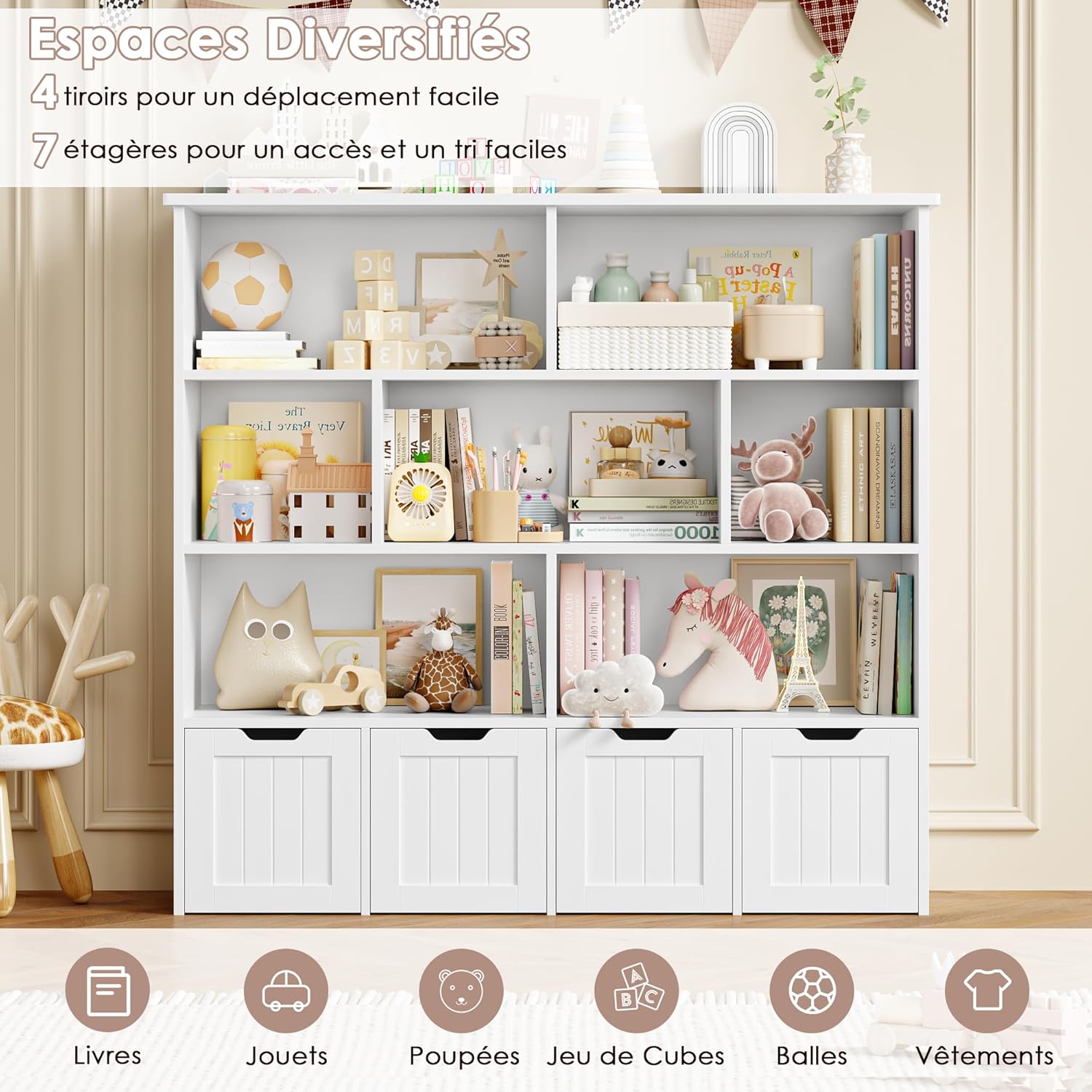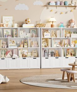 - Espace Spacieux et Organisé: Cette bibliotheque enfant mesure 125,5x33x118cm. 7 compartiments ouverts et 4 tiroirs à roulettes du meuble rangement enfant offrent un espace suffisant pour les livres, les jouets, les poupées, les vêtements et autres objets du quotidien, permettant aux enfants de trouver facilement ce dont ils ont besoin, de cultiver de la bonne habitude de rangement et de rendre la chambre des enfants rangée et ordonnée en un instant