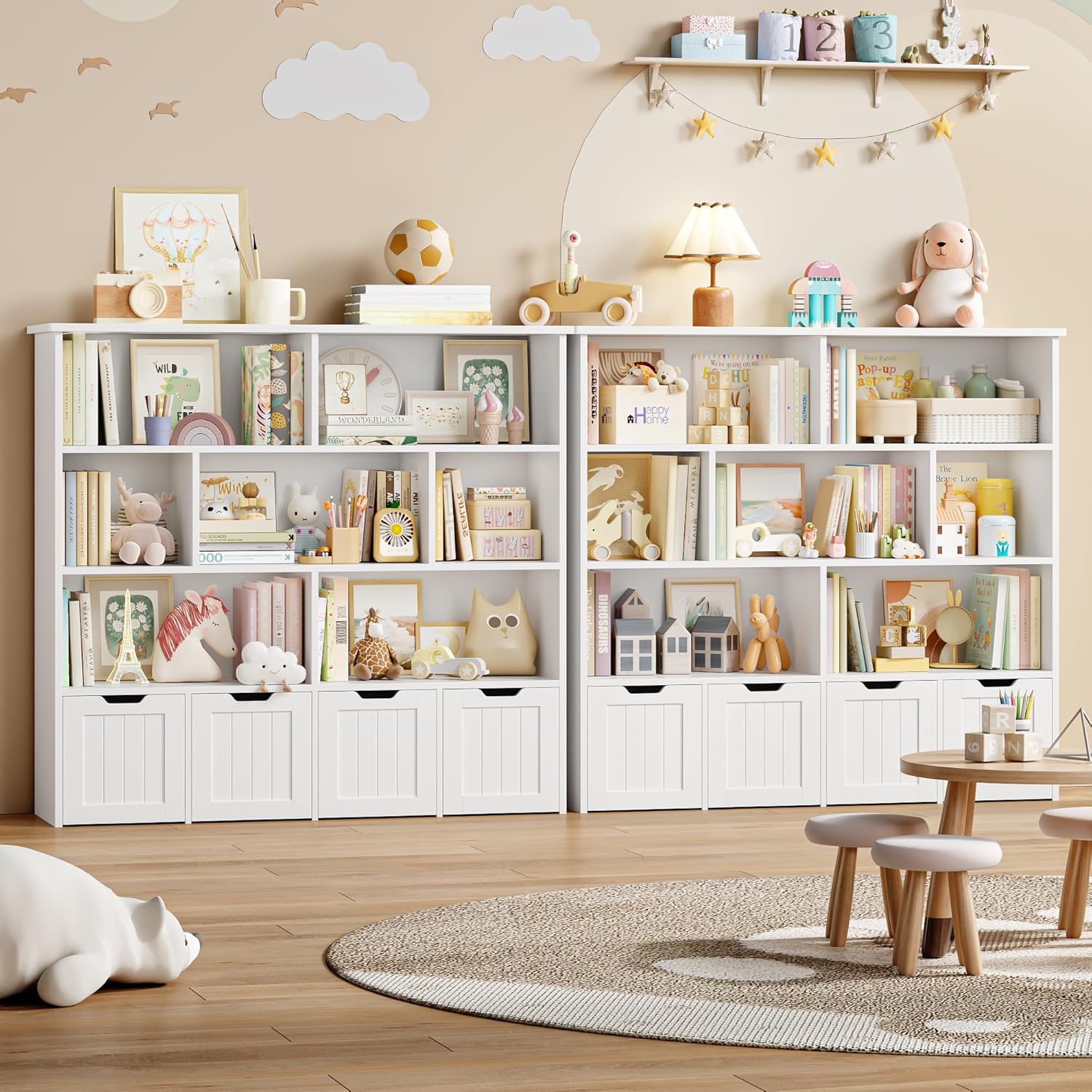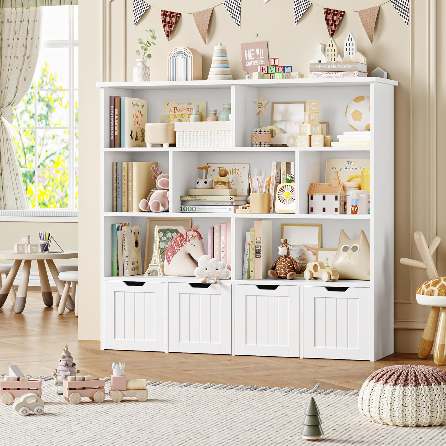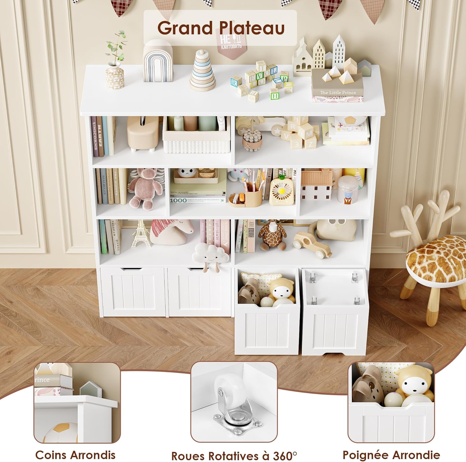 Meuble très pratique et bien conçu, facile à monter et offrant beaucoup de rangement grâce aux 8 étagères et 4 tiroirs roulants; la finition blanche est sobre et s’intègre bien dans la chambre, les tiroirs glissent sans problème et l’ensemble semble solide pour un usage quotidien — parfait pour organiser les jouets et les livres des enfants.