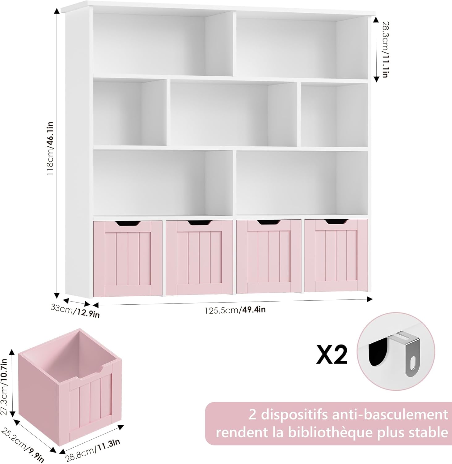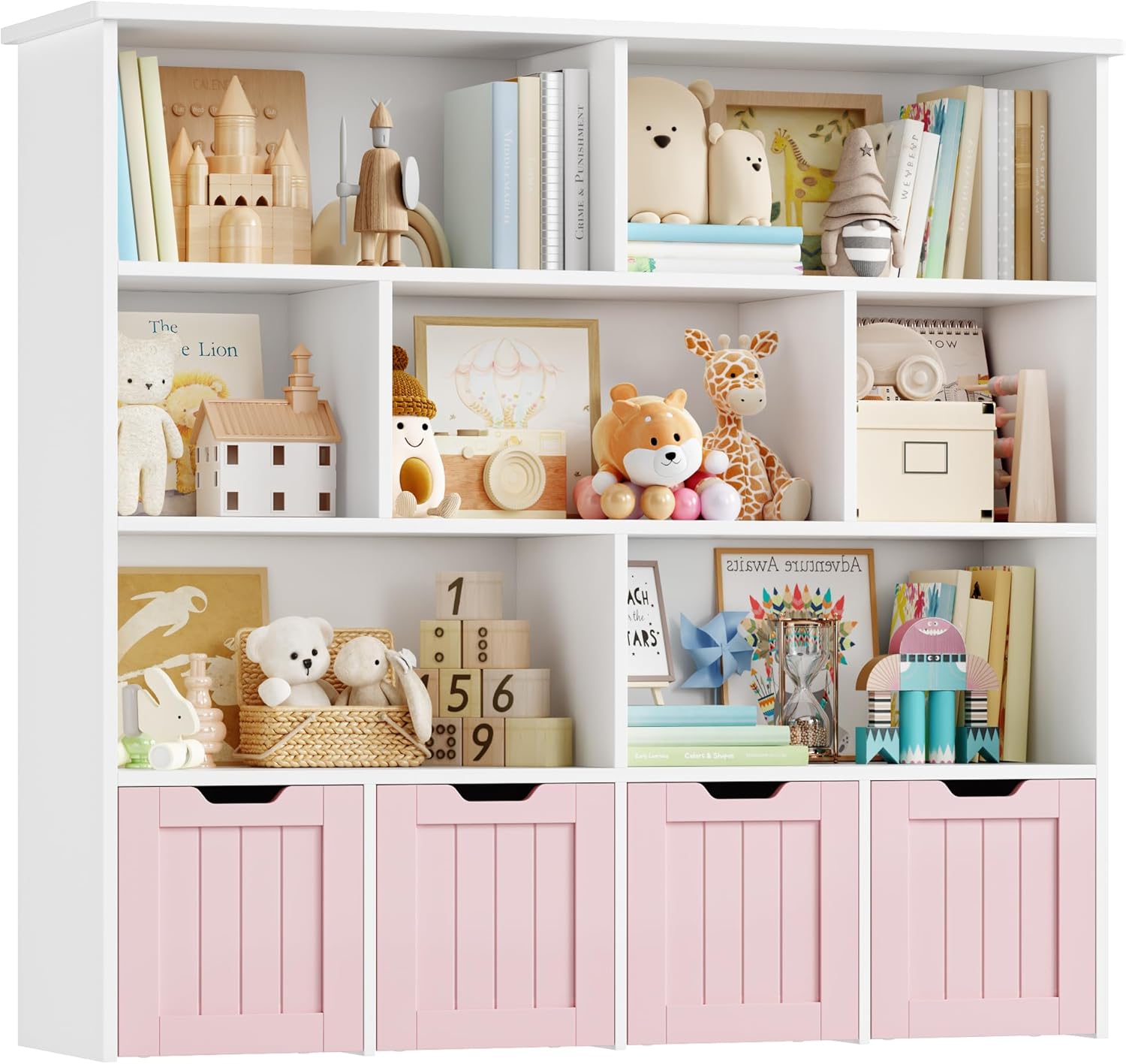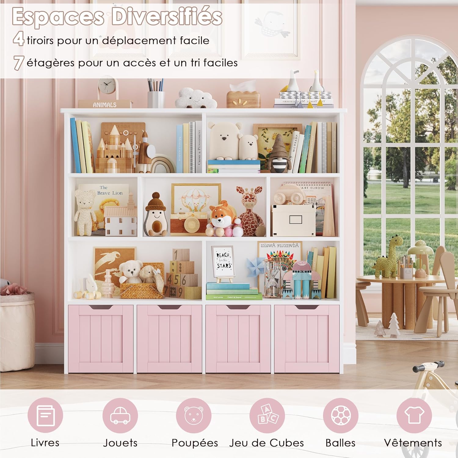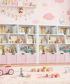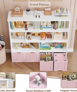 Meuble pratique et bien pensé avec huit étagères et quatre tiroirs roulants qui facilitent le rangement des jouets et des livres, la taille convient bien à une chambre ou une salle de jeu, la finition rose est jolie et l’assemblage est simple, les matériaux semblent suffisamment solides pour un usage quotidien.