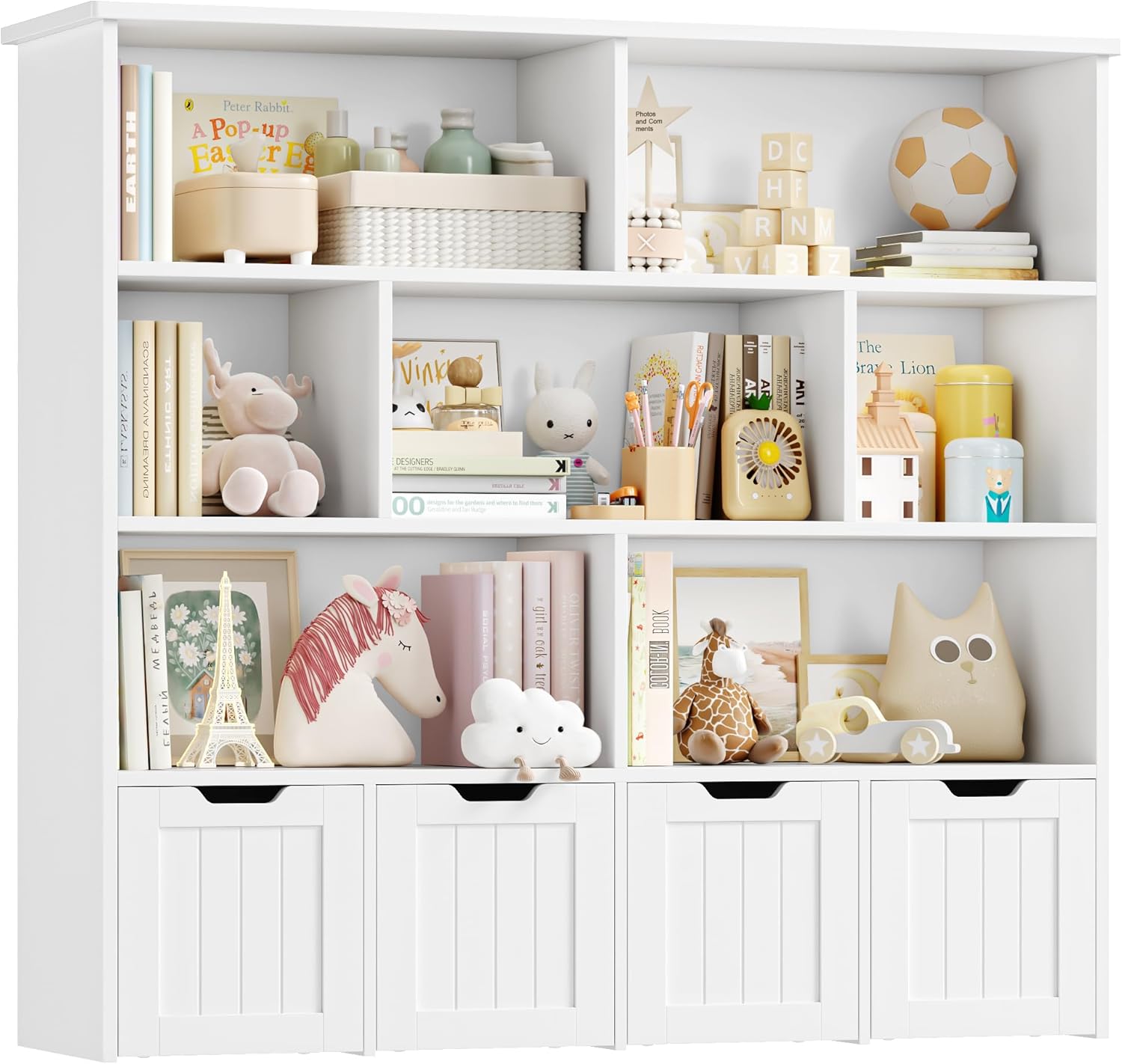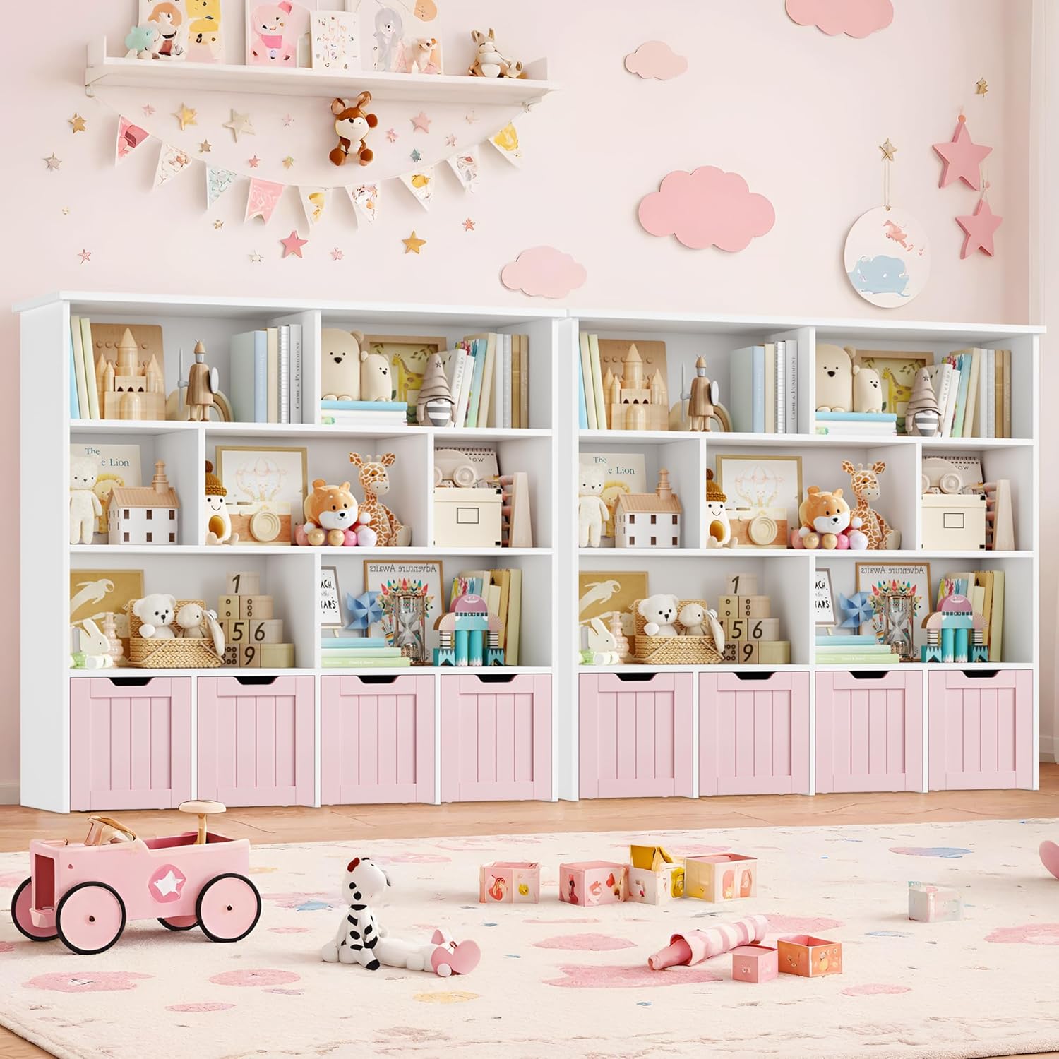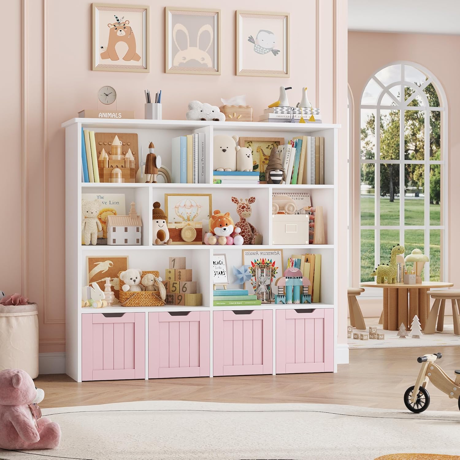 Meuble pratique et bien pensé avec huit étagères et quatre tiroirs roulants qui facilitent le rangement des jouets et des livres, la taille convient bien à une chambre ou une salle de jeu, la finition rose est jolie et l’assemblage est simple, les matériaux semblent suffisamment solides pour un usage quotidien.