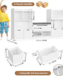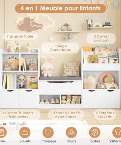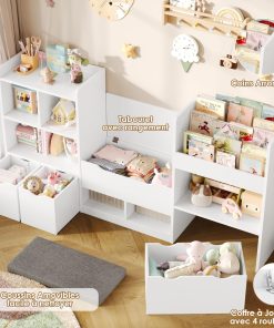 - [4 en 1 Meuble de rangement ] : La conception en couches de la bibliotheque enfant met bien en valeur les couvertures des livres, aidant les enfants à reconnaître les couleurs et les motifs. 11 grands espaces de rangement permettent aux enfants de ranger leurs jouets, poupées, livres ou vêtements préférés. Les deux tailles de boîtes de rangement à 306° permettent aux enfants de s’amuser tout en rangeant la pièce. Le banc avec rangement pour cacher facilement oreillers, couvertures, etc