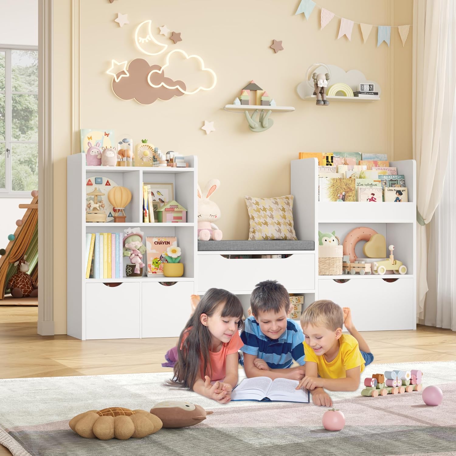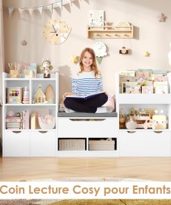 - [Créez un coin lecture soigné] : Ce meuble de rangement enfant de 183,5 cm de long avec banc avec rangement, y compris 7 étagères ouvertes, 1 coussin amovible, 3 tiroirs à roulettes et 1 étagère à livres à 3 niveaux. Créez un coin lecture confortable et bien rangé pour votre enfant par cette bibliotheque enfant, lui permettant de profiter d’un moment de lecture tranquille entouré de livres